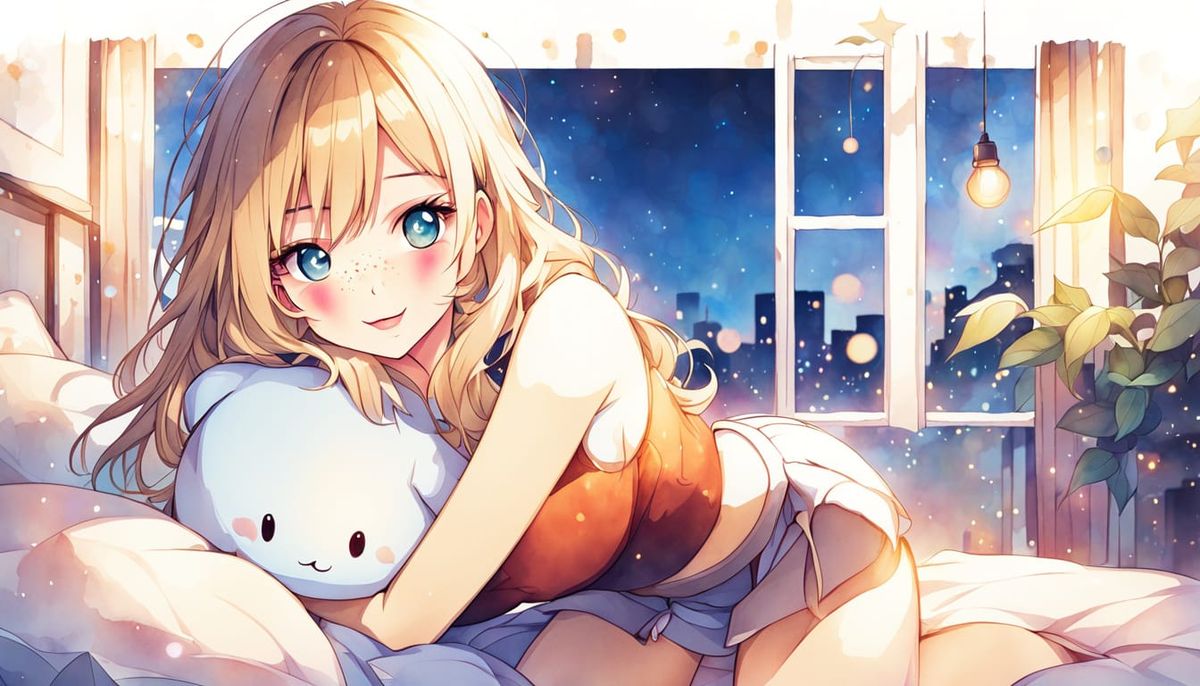 This image shows a whimsical blonde woman with blue eyes and freckles in an ink and watercolor style. The woman is sitting in her bedroom in a dreamy, warm aesthetic.