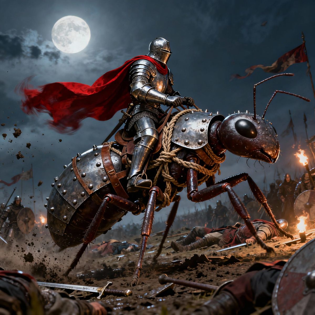 A photorealistic fantasy scene featuring a knight in full plate armor riding a massive, steel-plated ant across a moonlit medieval battlefield. Features cinematic lighting and ultra-detailed textures.