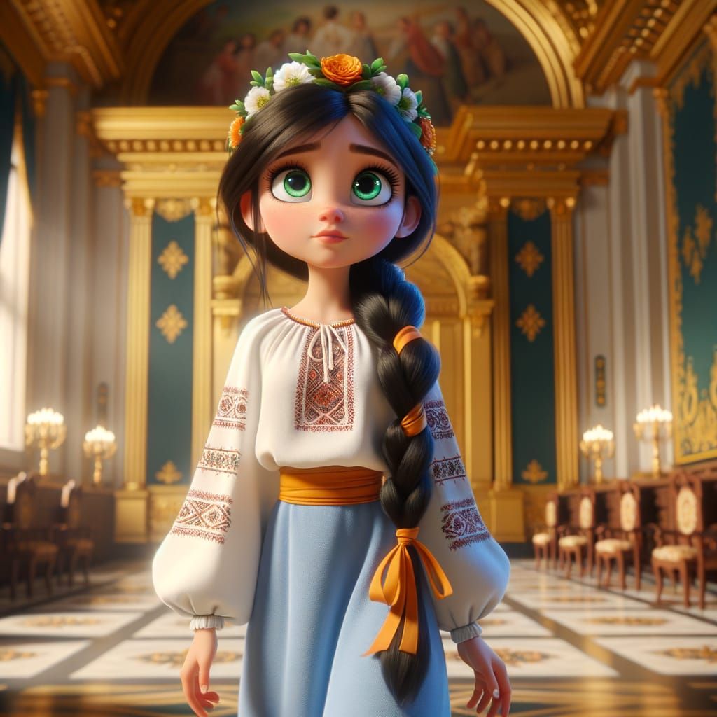 This image shows a Ukrainian girl in traditional dress walking through a golden chamber. Her large eyes gaze upward in a scene reminiscent of classic animated fairy tales, full of grace and solemnity.