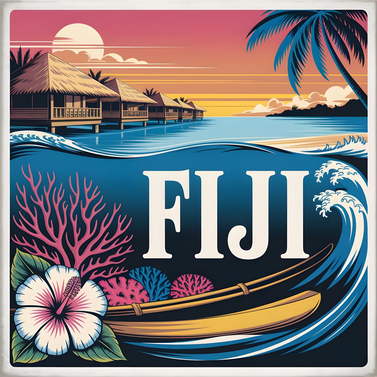 A vintage-style travel poster evokes the serenity of Fiji. It features overwater bungalows, vibrant coral reefs, and calm beaches, capturing a warm and inviting tropical island aesthetic.
