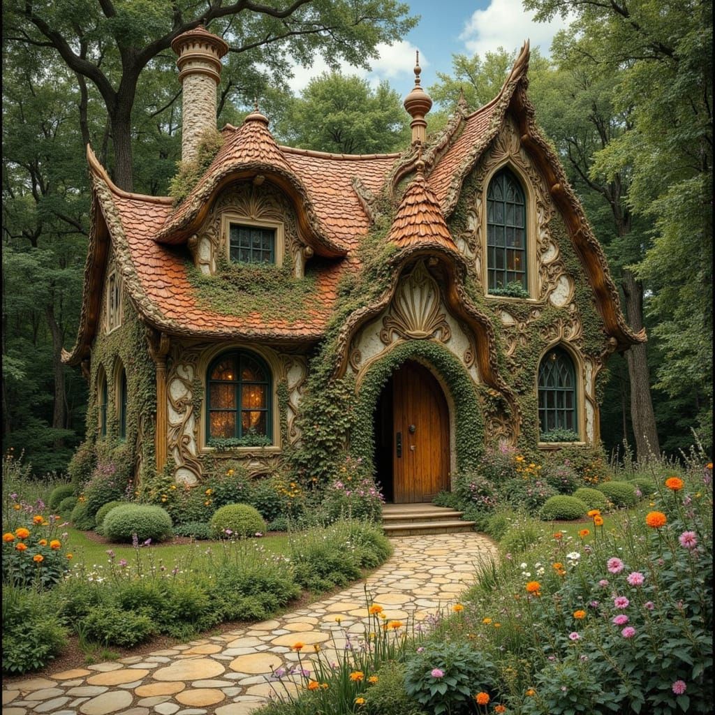 A charming storybook cottage with intricate carvings, flowing lines, and stained glass, surrounded by wildflowers and greenery. Features ornate, folkloric artistry with golden accents.