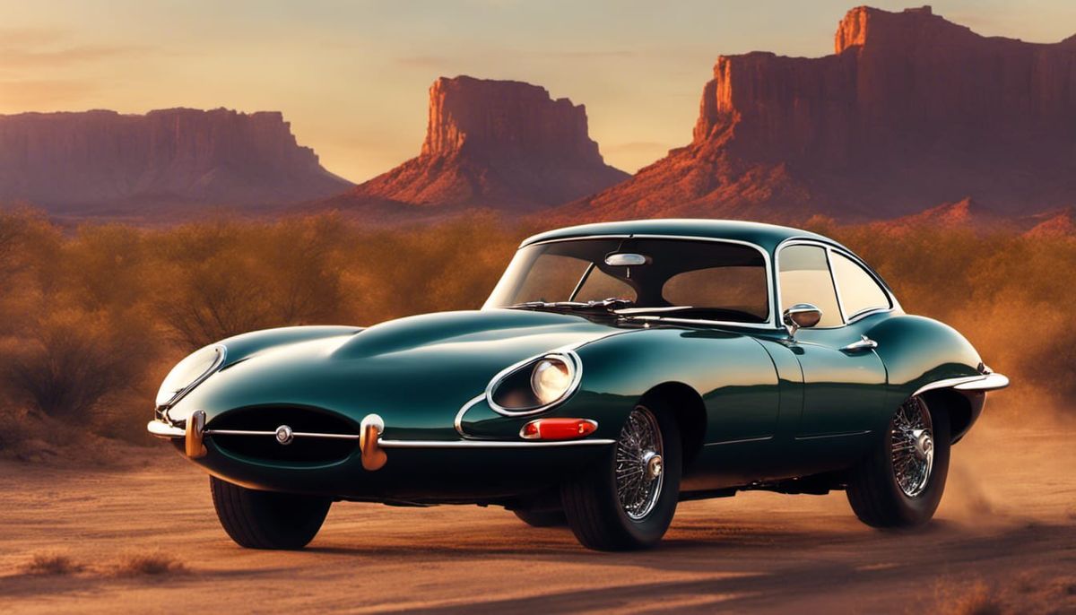 This image shows Sunset Shimmer driving a Jaguar E-Type through the Arizona desert. The picture is a digital matte painting with a cinematic and maximalist aesthetic.