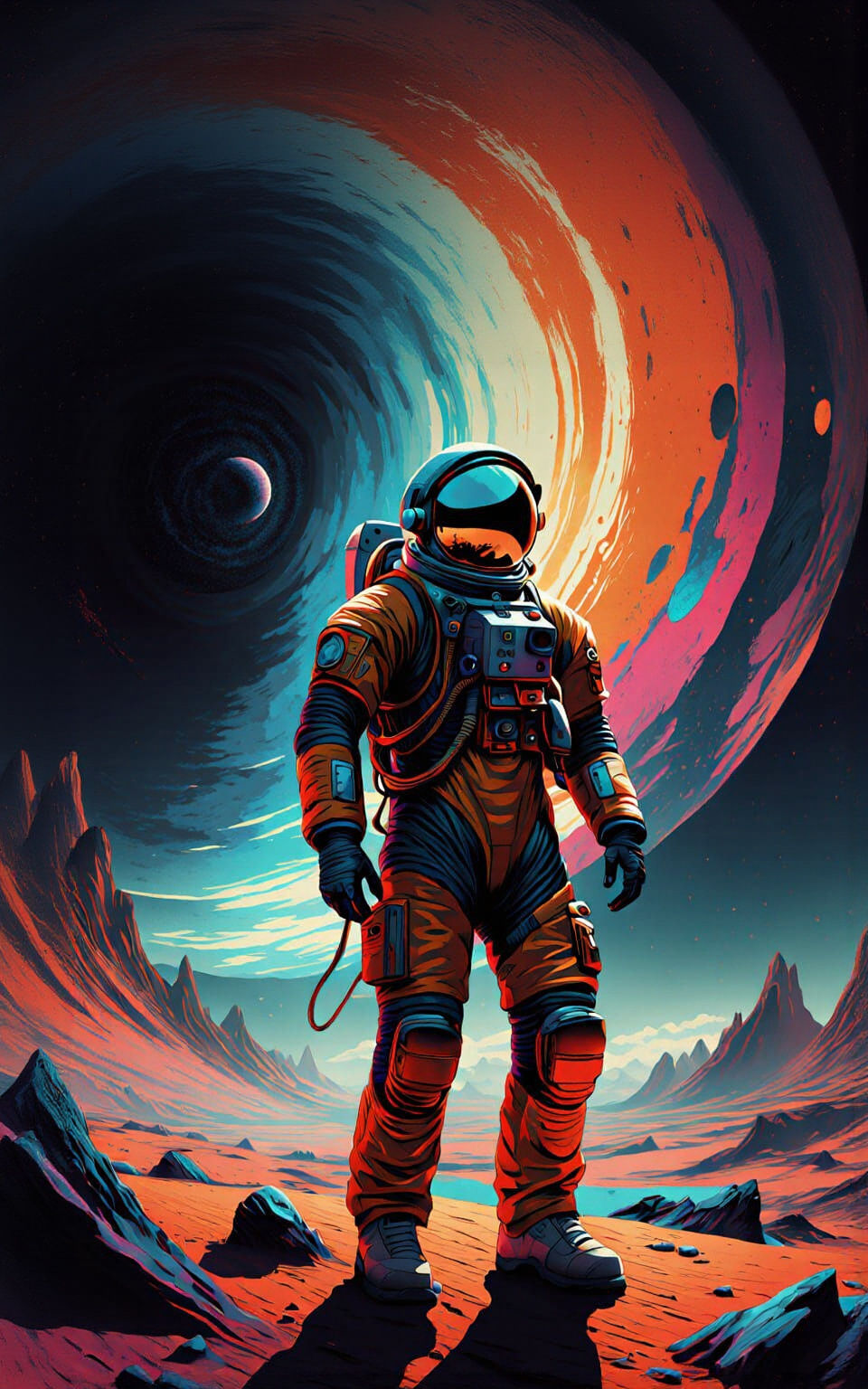 This image is a surreal and grotesque digital painting of a lone astronaut on a desolate alien planet, set against a swirling galaxy of vibrant colors, capturing a sense of cosmic wonder and horror.