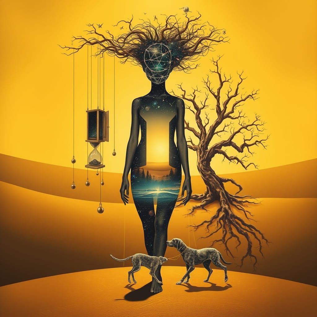 This image shows a surreal, monochromatic scene of a woman in a golden yellow sky, surrounded by impossible geometry, galaxies, and a tangle of disembodied clocks. Her face is obscured by a transparent mask, and her body is a gateway to multiple dimensions.