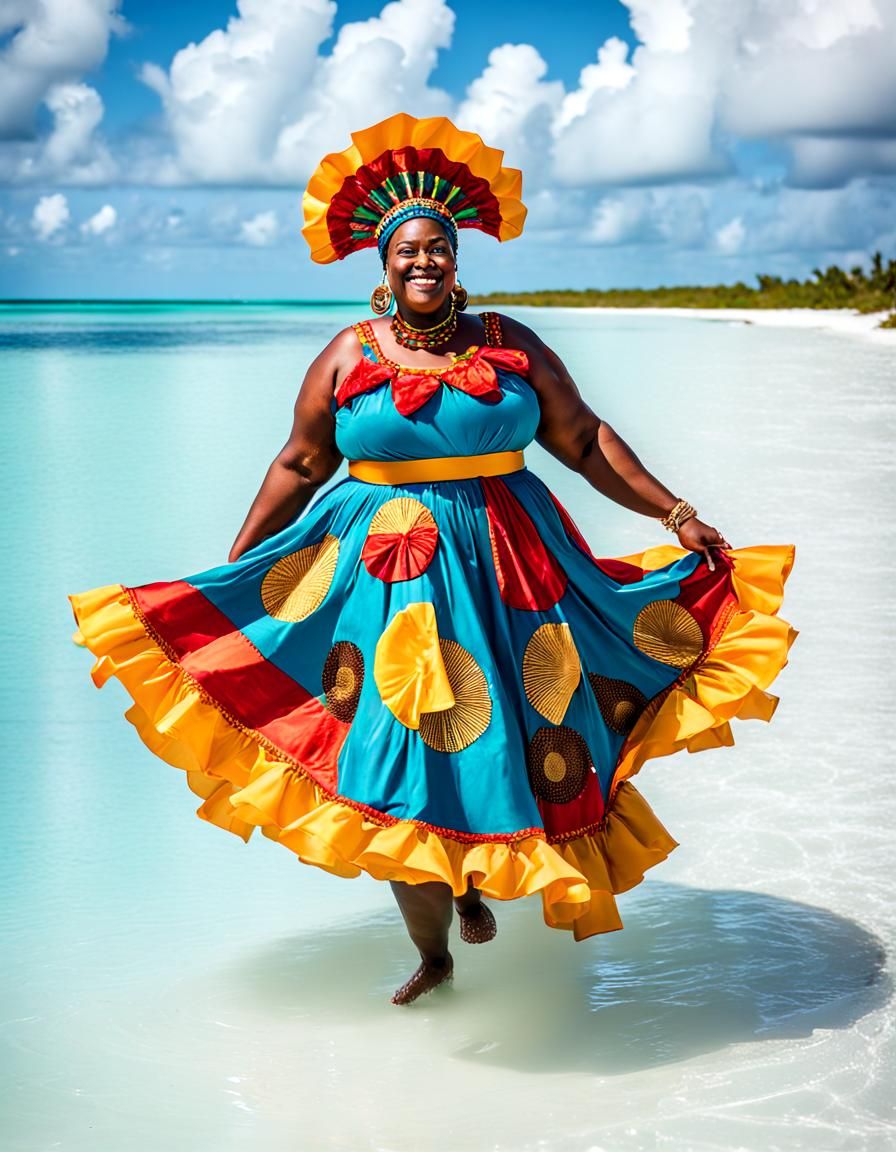 This image shows a plus-size African American woman in a vibrant carnival costume. She is walking on a sandbar surrounded by the ocean in the Bahamas, under a sunny sky.