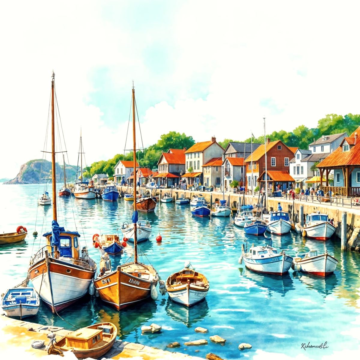 This image depicts a harmonious scene of a coastal village harbor with boats and shore life. Rendered in a vibrant, detailed watercolor style with saturated strokes.