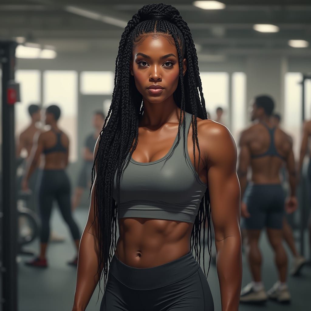 A striking portrait of a strong African American woman with intricate braids, standing out in a bustling gym, surrounded by blurred figures and exercise equipment, in a hyper-realistic digital art style.