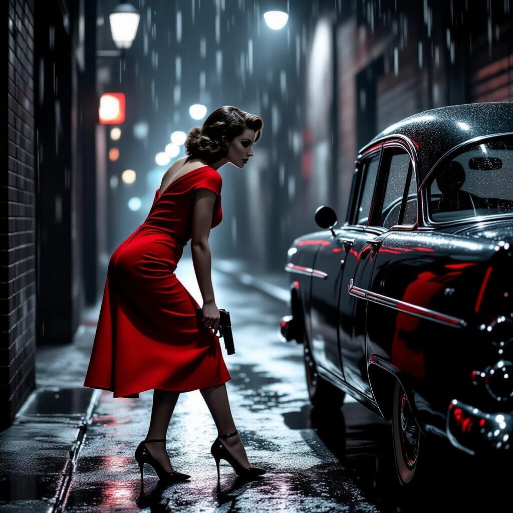 A striking picture of a woman in a red dress holding a pistol and peering into a car window in a dark, rainy alley. The image evokes a film noir aesthetic with stark contrasts.