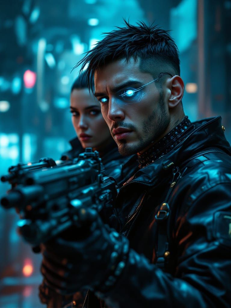 This image shows two operatives in black leather tactical gear, one with a glowing cyborg eye, wielding sci-fi weapons. Features a bold blue-teal aesthetic with high contrast.