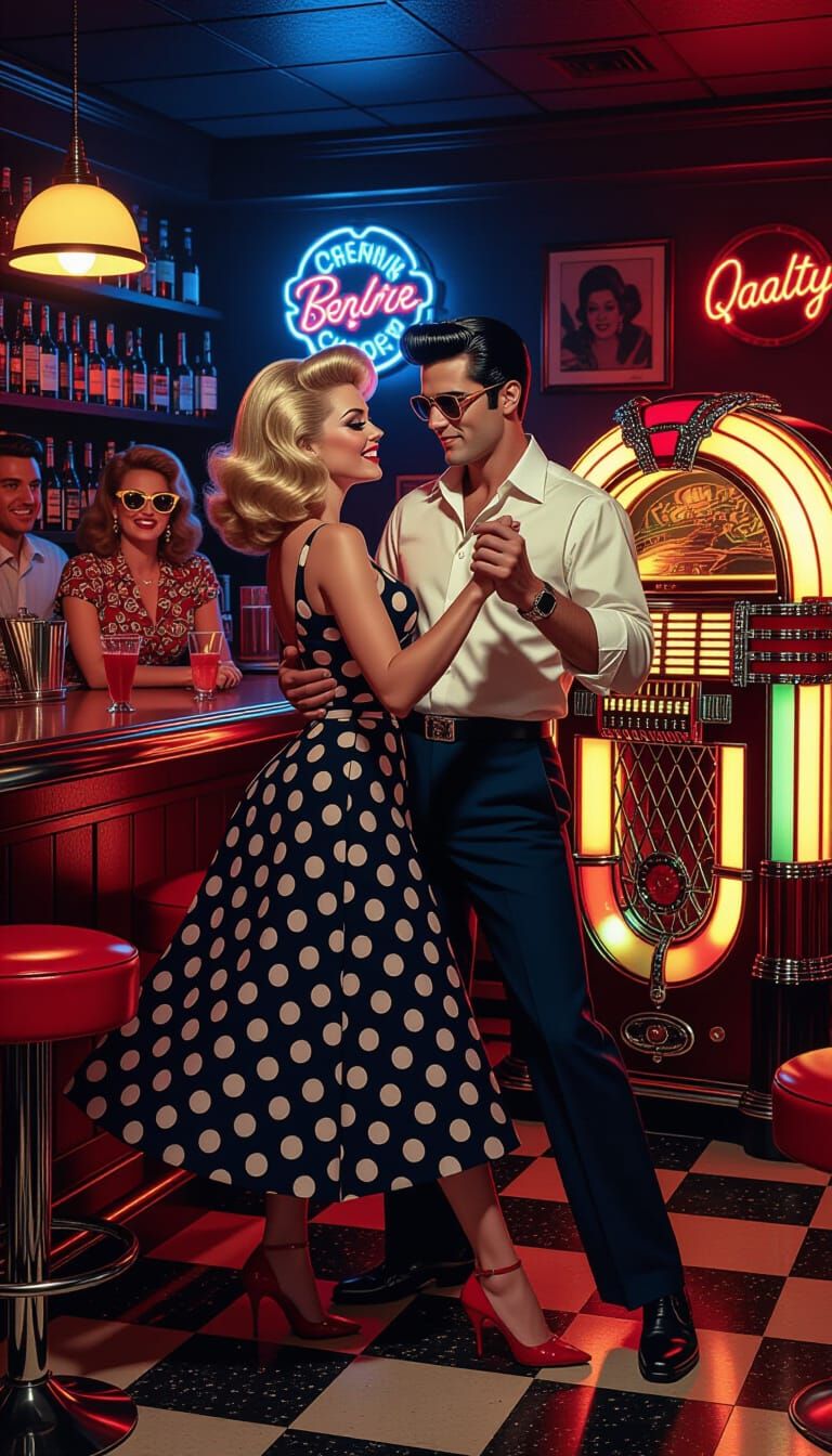 A vibrant image capturing a lively 1960s bar scene. Women in polka dot skirts and men with Elvis hairstyles dance amidst neon lights and retro details in a pop surrealist style.