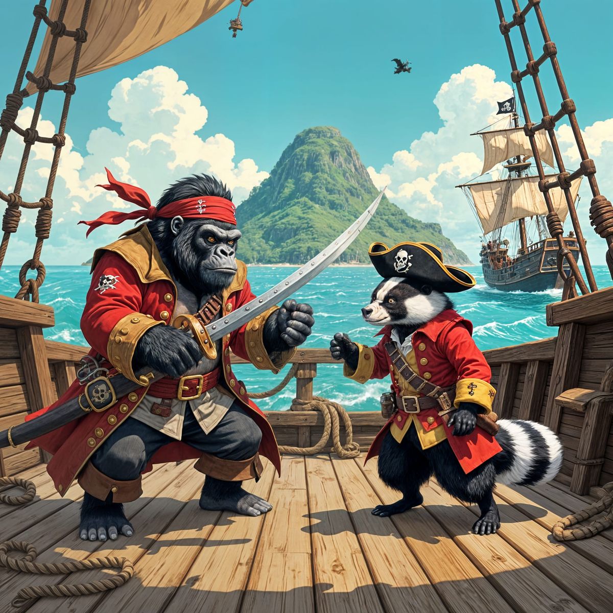This image shows two animals dressed as pirates engaged in a fierce battle on the deck of a ship, with a tropical island visible in the distance.