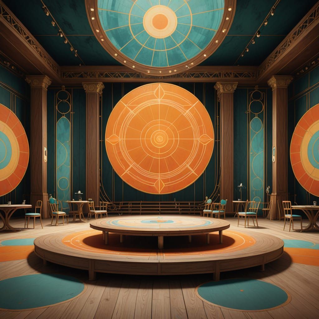 A vibrant interior scene depicts a wooden stage encircled by low tables, designed for storytelling, music and dance. The image features dynamic lighting and triadic colors as concept art.