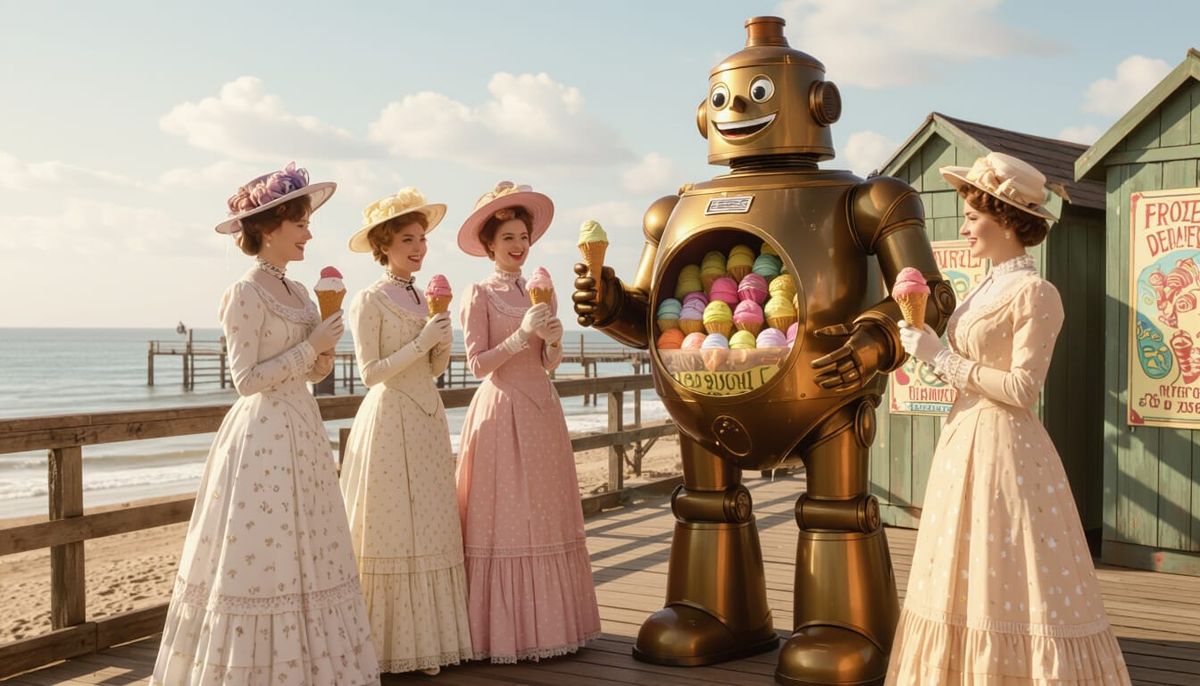 This image depicts elegantly dressed Victorian women on a sunny pier, sharing ice cream with a friendly brass robot. The scene, reminiscent of art nouveau, is rendered with warm, cinematic lighting and subtle film grain.