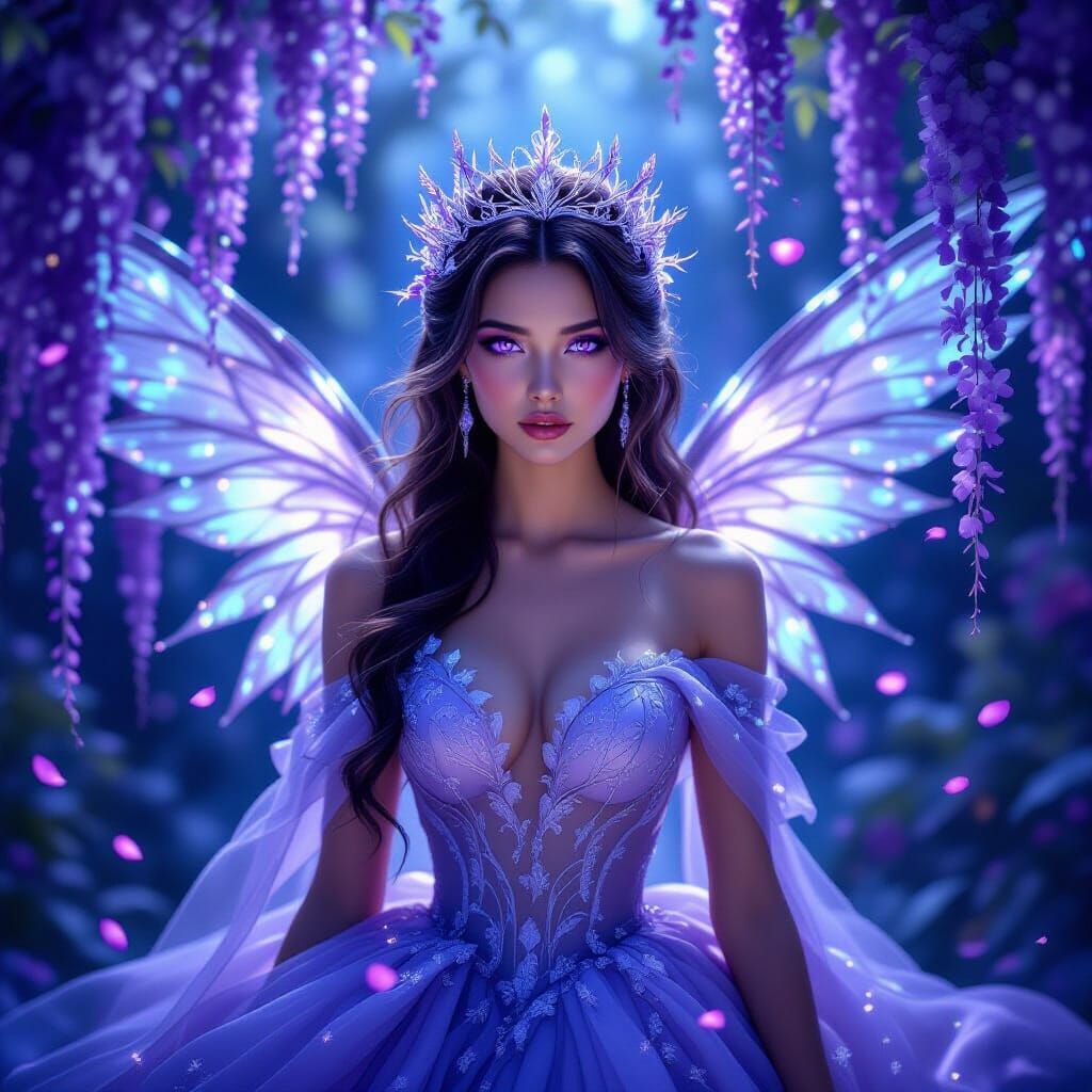 A striking picture of the Wisteria Veil Princess in an elegant pose. She wears a gown of cascading wisteria, with a crown of silver. The fantasy art is hyper-realistic with soft, ethereal lighting.