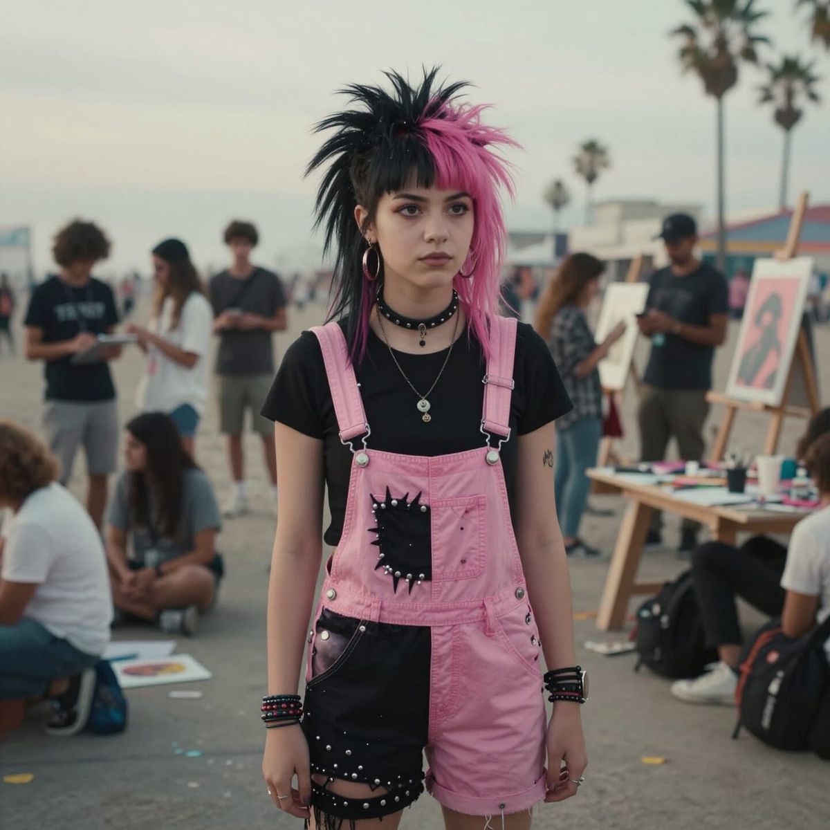 Cinematic film still of a punk girl with black and pink hair in baggy overalls and crop top, in a Venice Beach art class setting. Features film grain and dramatic lighting.