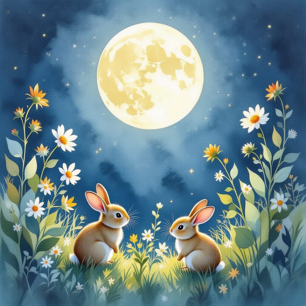 This image shows a full moon illuminating a garden at night, where bunnies nibble on plants. The watercolor art style uses delicate washes and soft, warm light to create a whimsical atmosphere.