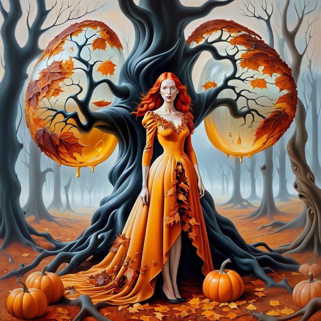 A surreal oil painting of a redhead wearing a dress of melting autumn leaves in a desolate forest, with a melting pumpkin nearby. The scene evokes a dreamy, ominous atmosphere.