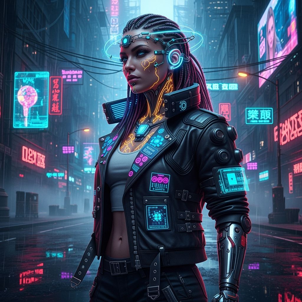 A hyperrealistic image shows a cyberpunk woman with braided hair, futuristic jewelry, and neon tattoos. The woman stands on a gritty, rain-slicked street in a cyberpunk aesthetic.