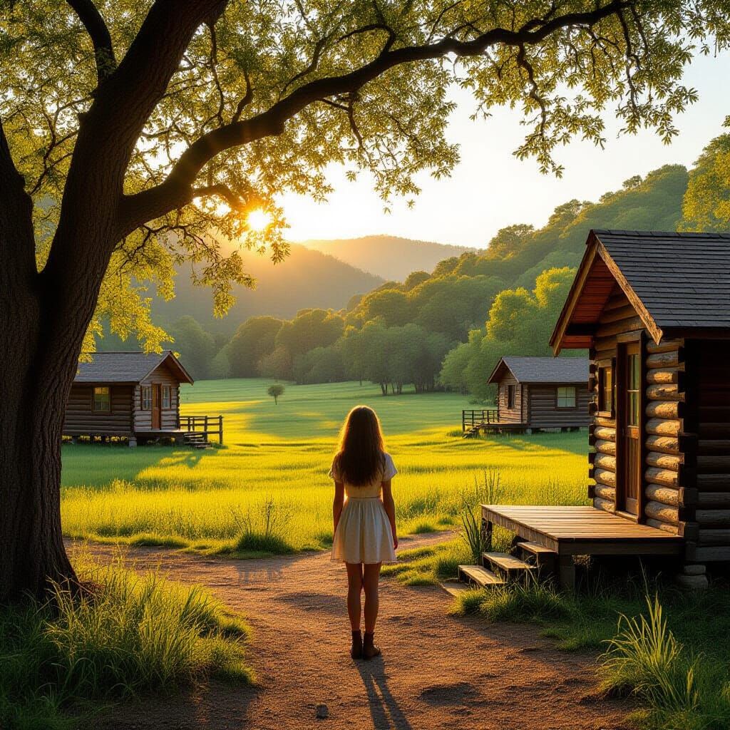 This image shows a girl at Camp Mystic near wooden cabins and the Guadalupe River. The scene is bathed in golden light and captured with photorealistic detail, creating a serene, rustic atmosphere.