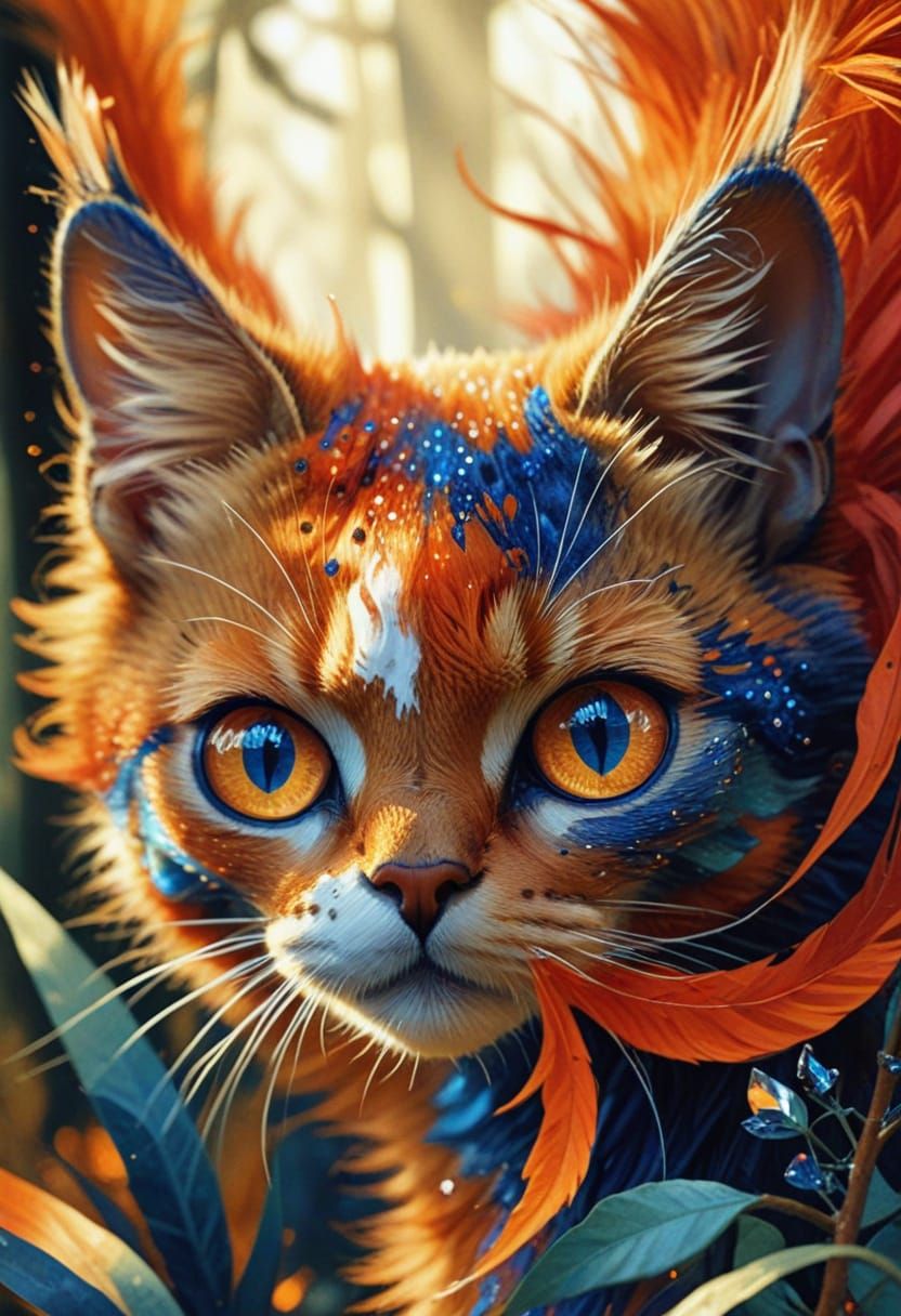 A striking picture of a cat with a long neck and tail in a mystical forest, rendered in vibrant orange and ruby red watercolor with sapphire blue eyes. The image is reminiscent of Art Nouveau and Pop Art.