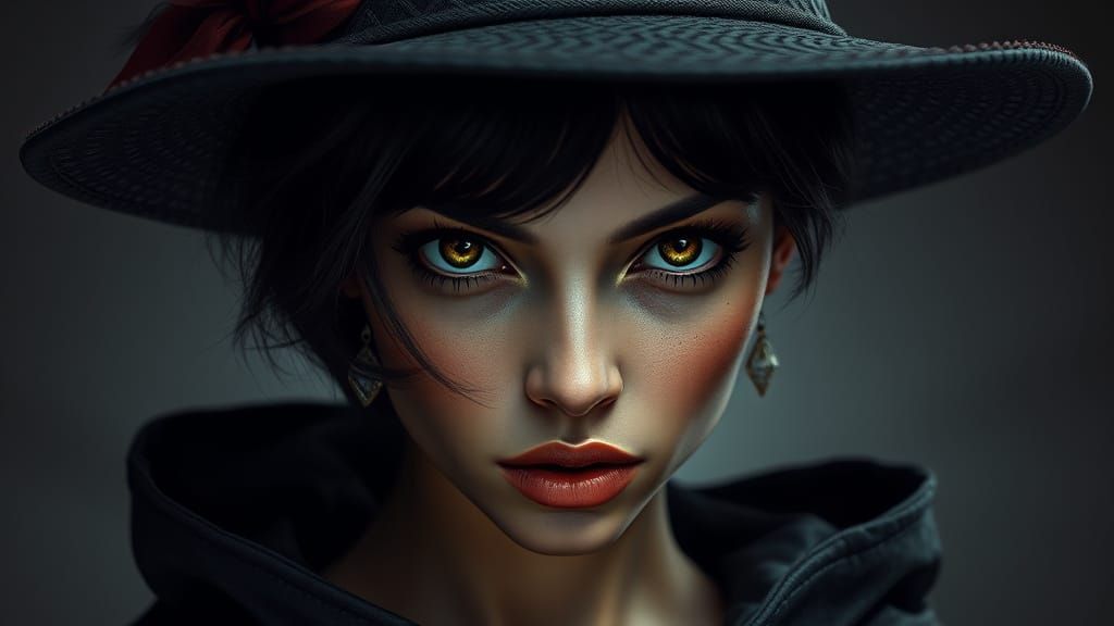 A striking image of a mysterious young woman with piercing yellow eyes, styled in a hyperrealistic aesthetic with fantastical elements, blending precision details and vibrant textures with deep, complementary colors