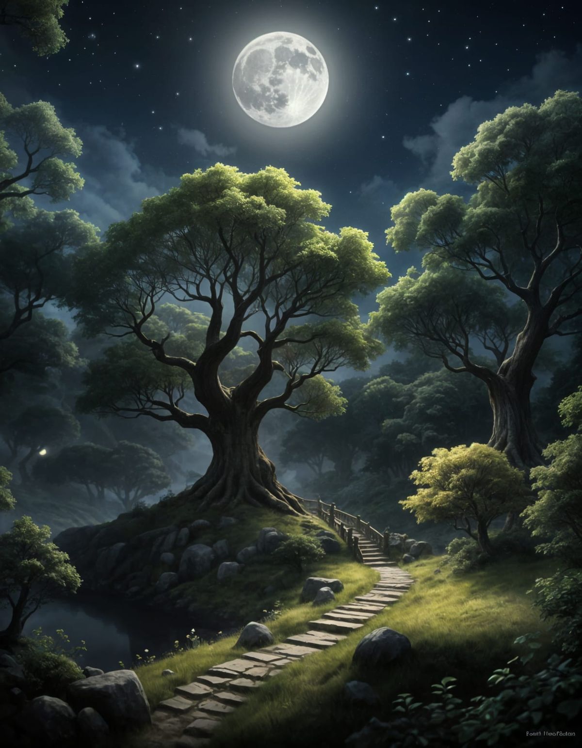 This AI-generated image captures a serene moonlit scene over the mystical forest of Lothlorien, evoking a sense of enchantment and fantasy.