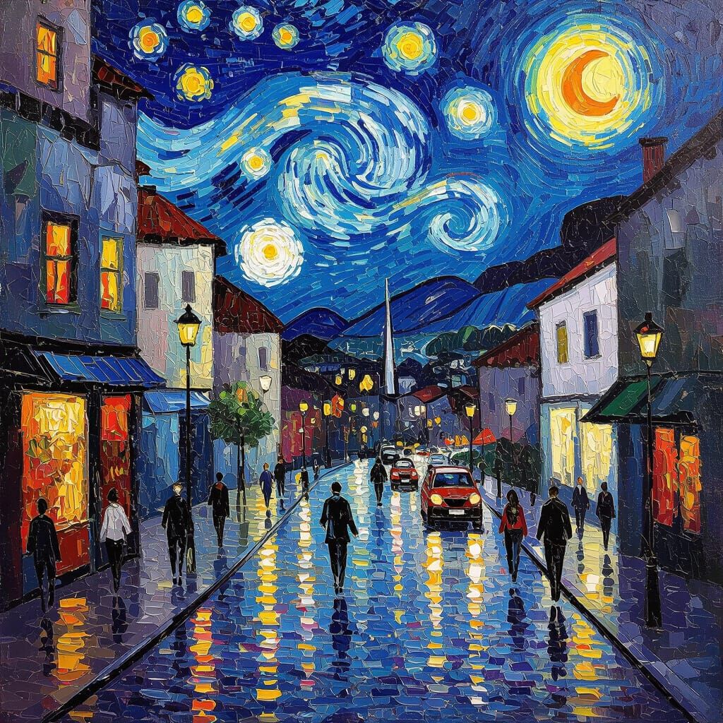 This oil painting depicts a lively street scene using expressive, impasto techniques with thick, textured paint. Dramatic lighting and bold colors create a dynamic visual experience.