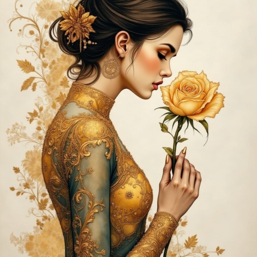 A detailed pen and ink illustration of Belle delicately holding a rose. The artwork features layered designs and intricate linework, reminiscent of alcohol ink techniques.