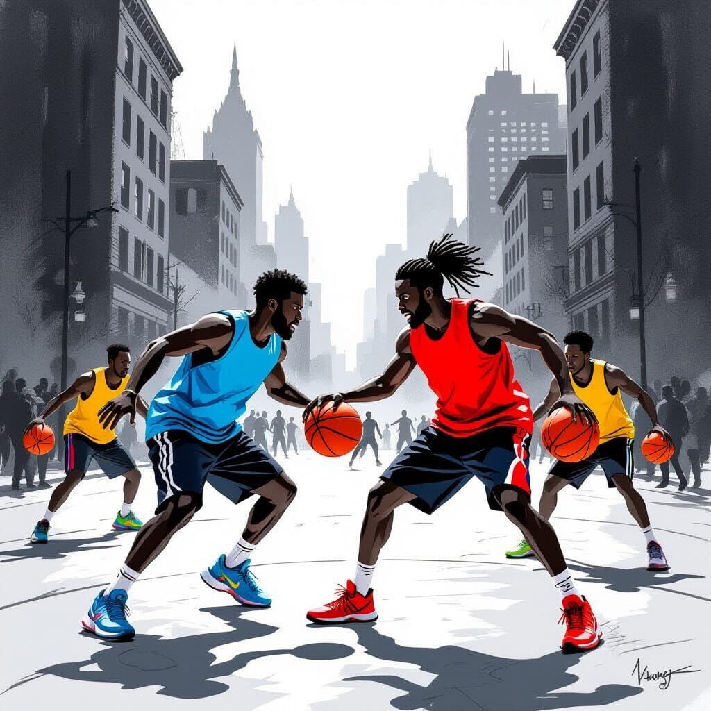 This image captures a dynamic twilight street basketball game with players in motion, rendered with expressive charcoal and graphite strokes, evoking a gritty, urban feel.