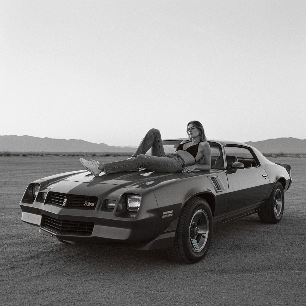 A striking woman in jeans and sneakers rests on a vintage Camaro in a desert at sunset. Captured in timeless black and white, this image evokes a cinematic mood with profound depth.