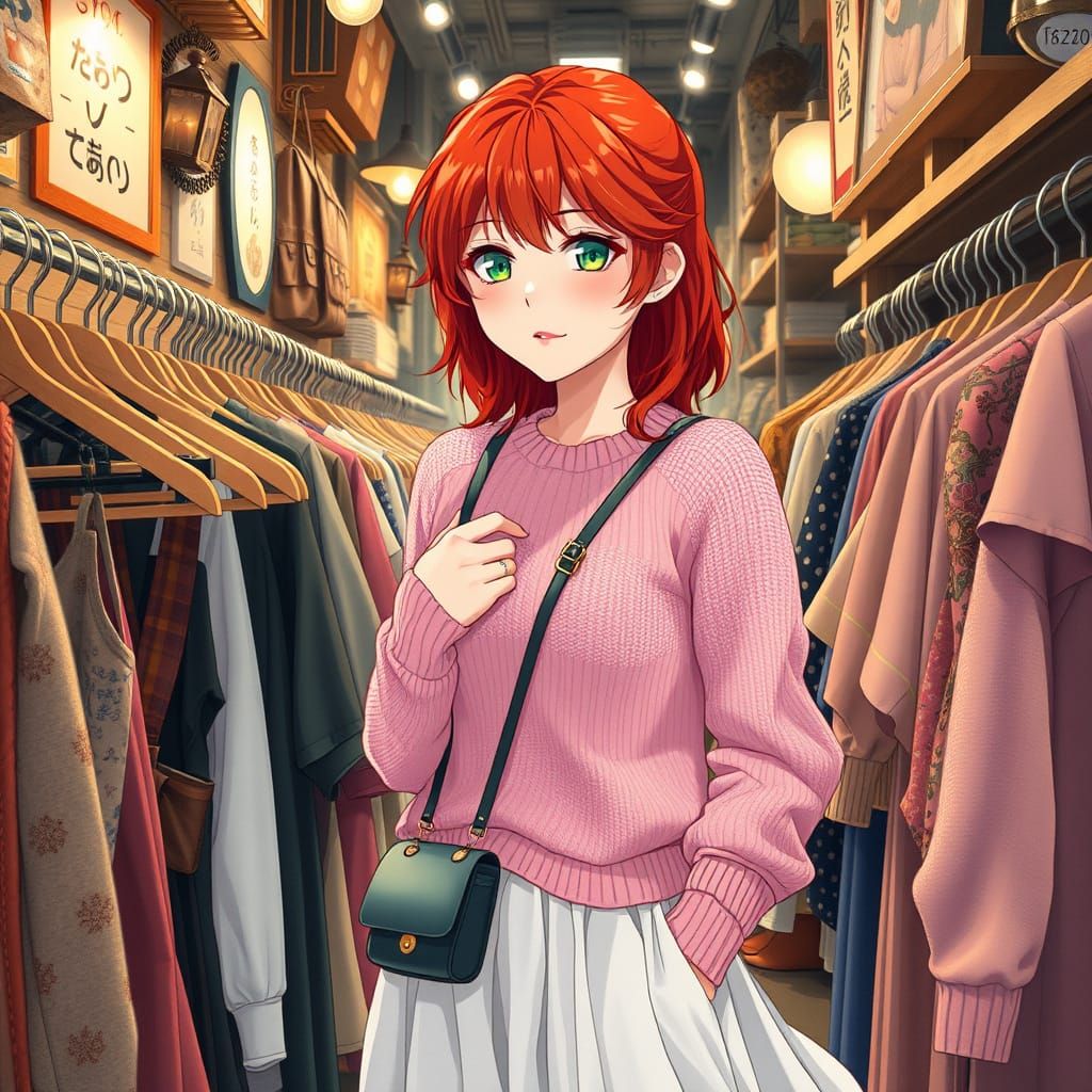 This image shows a stylish anime woman browsing through vintage fashion racks in a dimly lit Omotesando shop, surrounded by nostalgic Japanese street fashion decor and intricate textures.