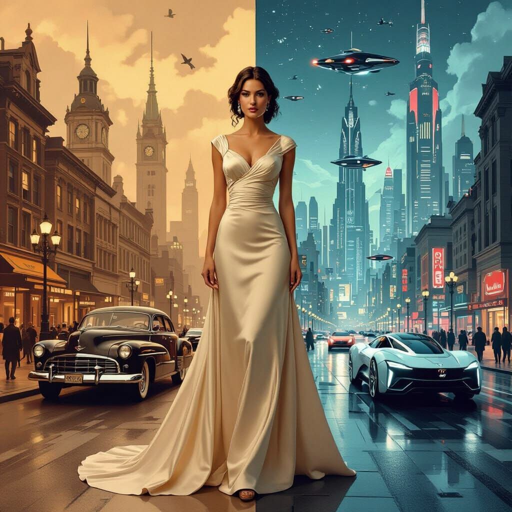 This image shows a woman standing between a nostalgic, sepia-toned vintage city and a vibrant, futuristic metropolis. The vintage side evokes nostalgic scenes, while the futuristic side features flying vehicles and neon lights.