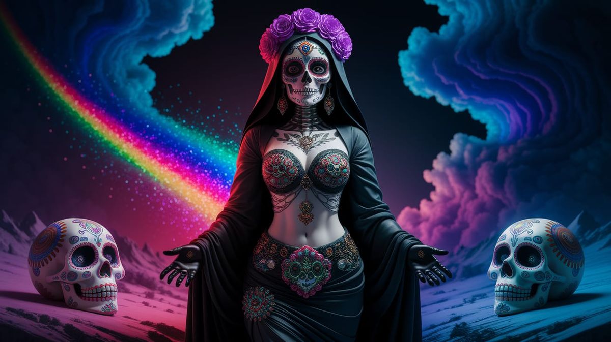 A striking picture of a Santa Muerte figure in a surreal, 3D-rendered landscape. The figure features intricate sugar skull details and a vibrant color palette set against dark, ominous neon blue clouds.