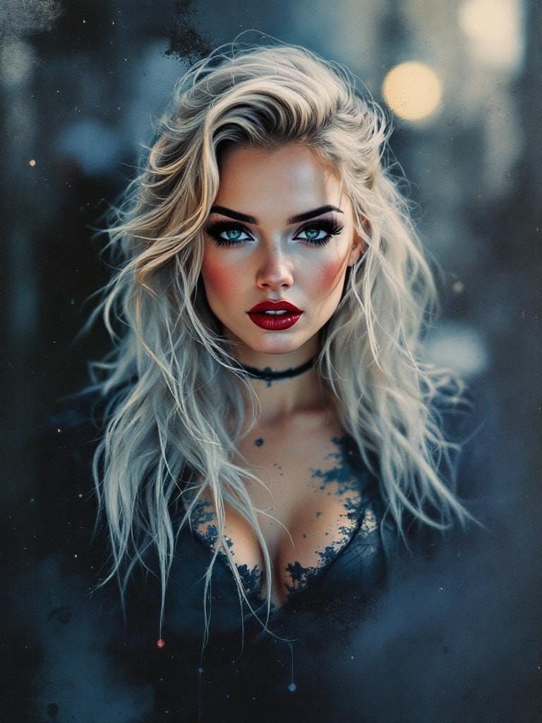 This image shows a full-bodied 1950s blond pin-up woman with bold eye contact. The artwork features watercolor bleeding, smoky transitions and textural painting, in a surreal artistic style with muted earthy tones and silver highlights.