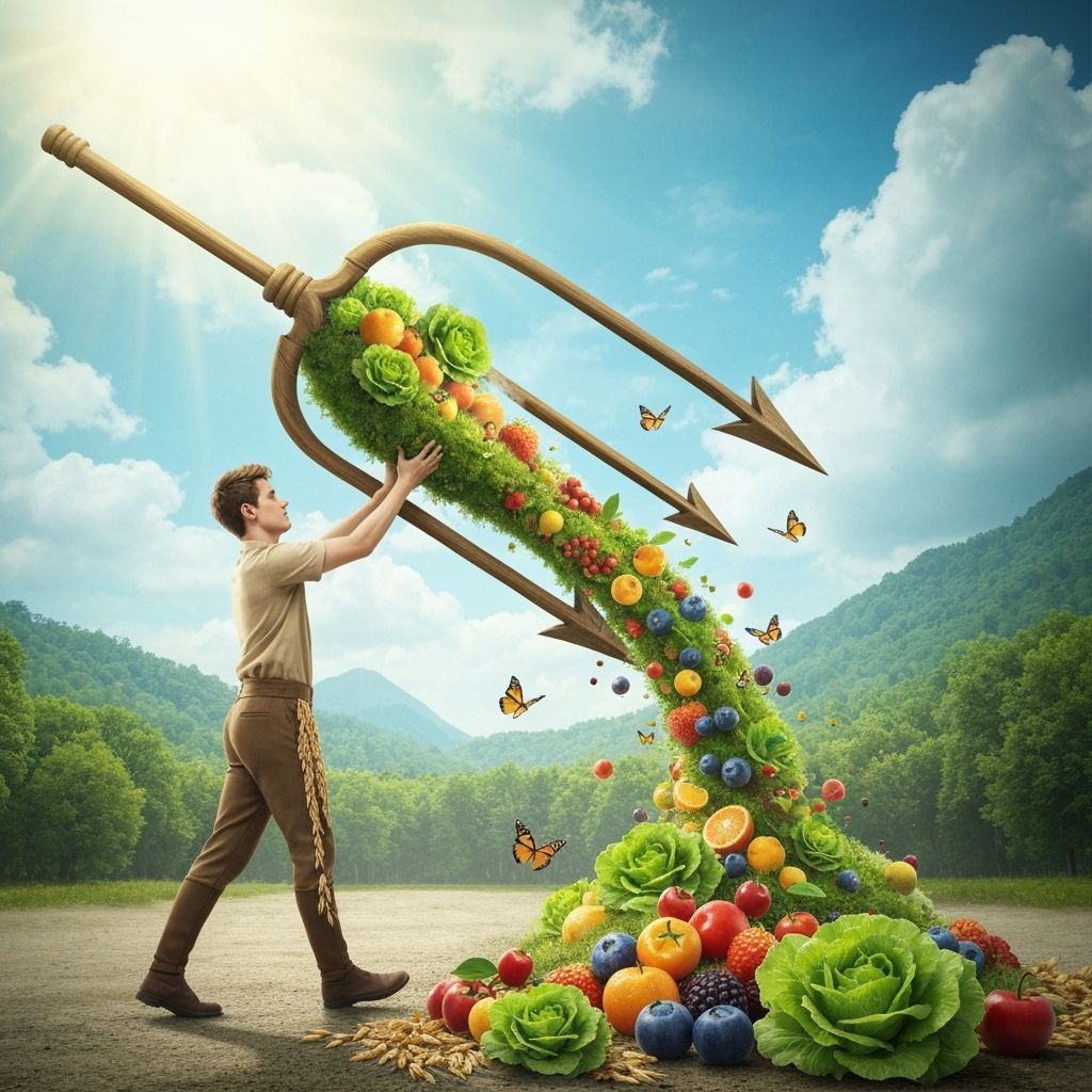 This image shows a man made of wheat pouring a summer landscape onto the ground. Vivid fruits, lettuces, and butterflies emerge, transforming the area into a paradise. The image is ultra-realistic with cinematic lighting.