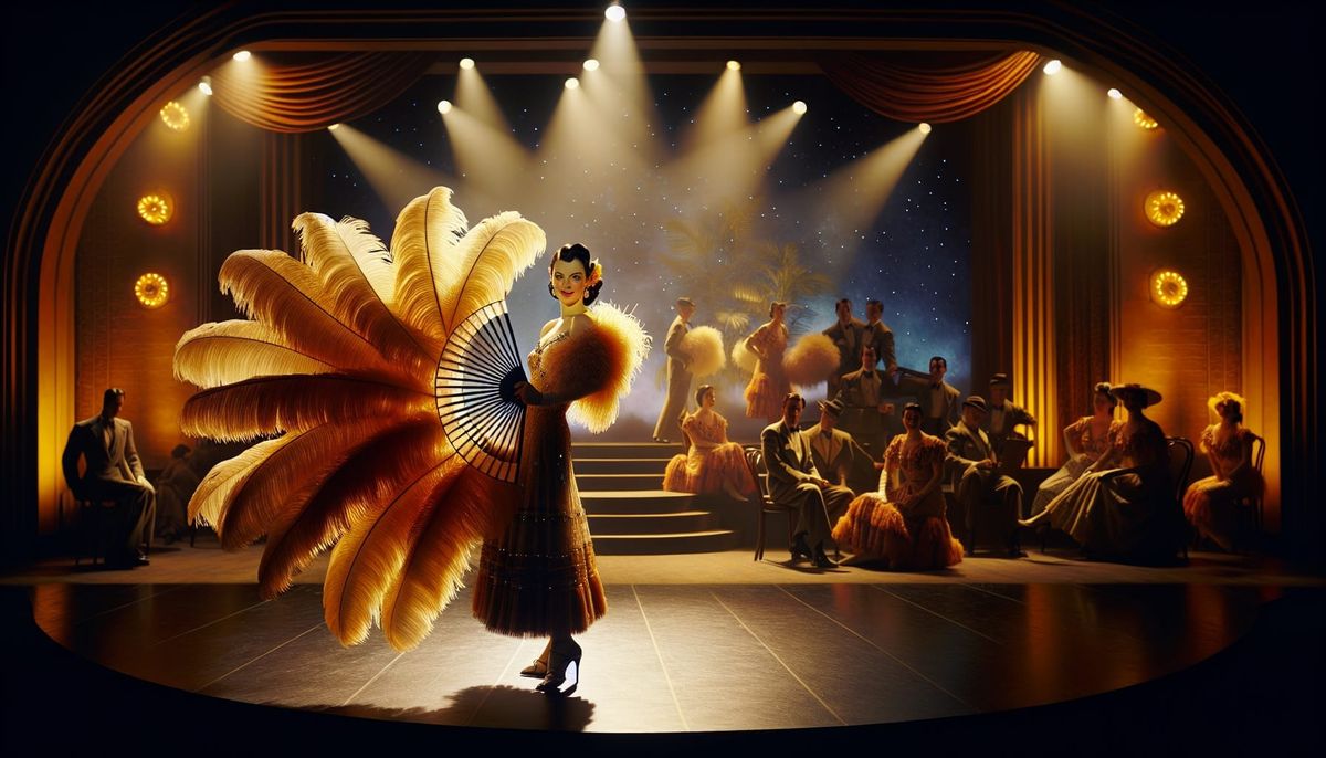 This image shows a Hispanic showgirl on a 1940s nightclub stage. She holds large feather fans, creating a sense of mystery, captured in a photorealistic style with dramatic lighting and warm colors.