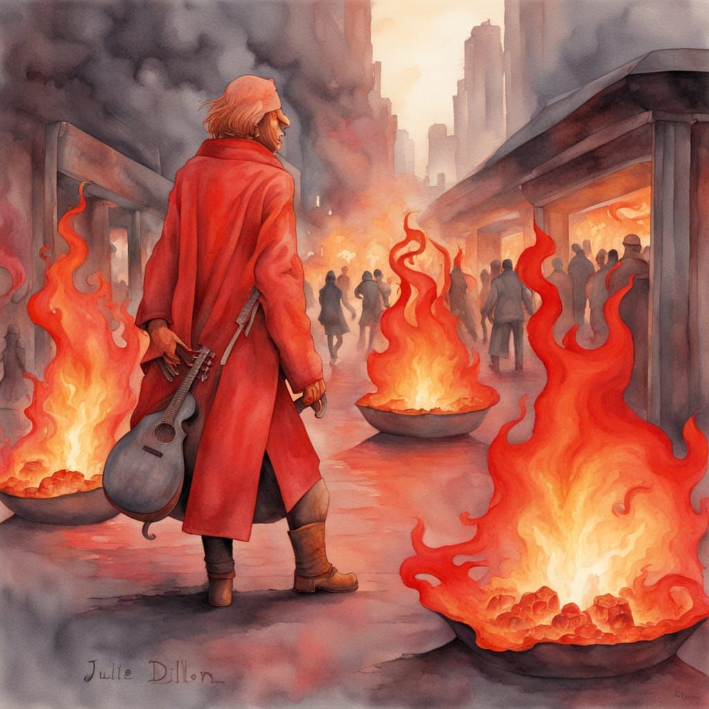 A watercolor fantasy illustration of a shape-shifting street performer in a fiery red underground market. The artwork has a dreamlike and hazy quality, reminiscent of Julie Dillon's style.