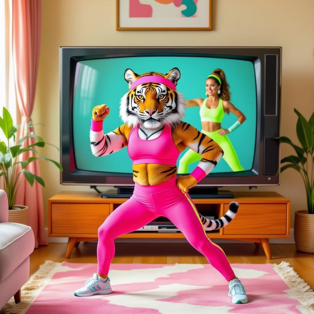 This image shows an anthropomorphic tiger in a neon aerobics outfit doing exercises in a living room. The scene is reminiscent of the 1990s, with bright colors and bold patterns.