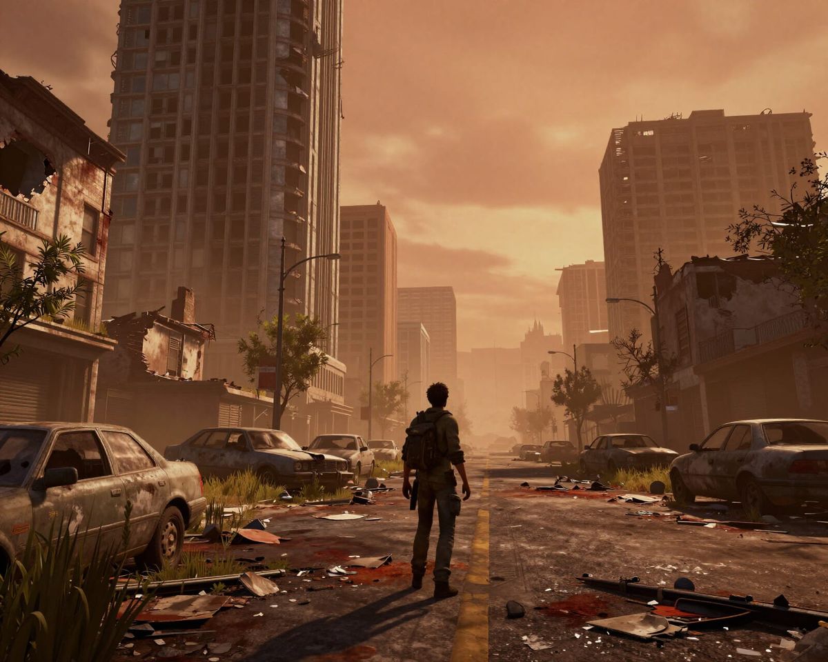 A lone survivor explores desolate, weed-choked streets of downtown Phoenix after a zombie apocalypse. Detailed 3D render with dynamic lighting and epic composition.