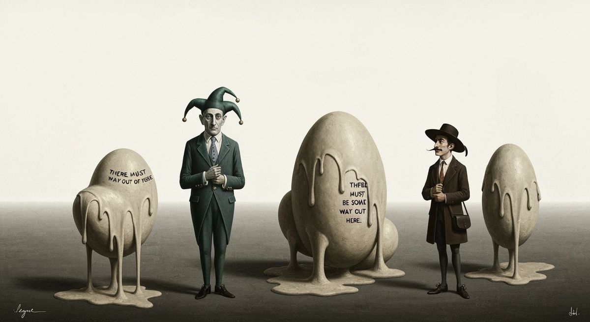 This image depicts a surreal landscape in the style of Magritte and Bruegel, featuring a joker and thief amidst melting textures. The scene evokes existential unease with clear linework and dreamlike distortions.