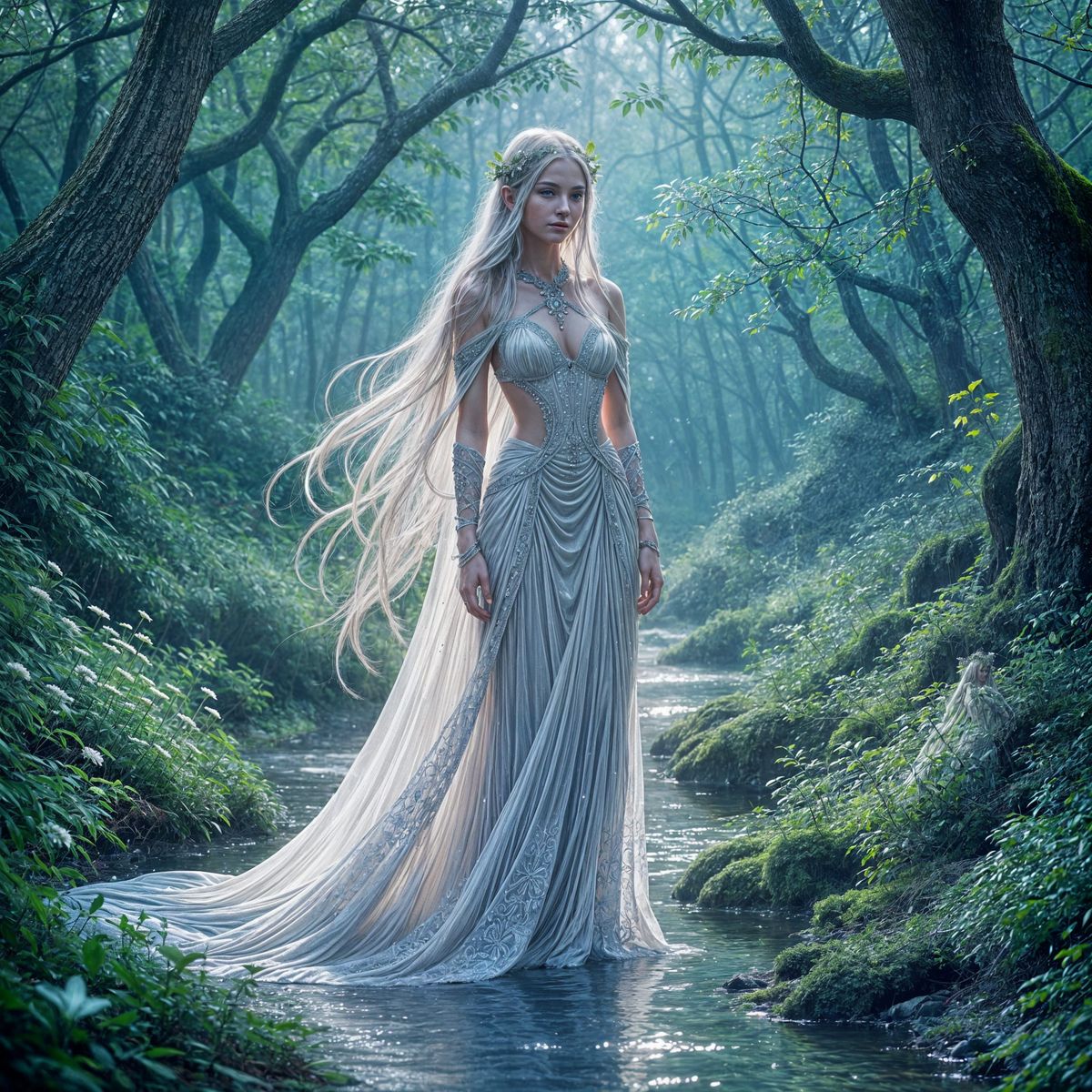This image shows an elven woman in a starlight gown in a magical forest. Bioluminescent plants and streams add to the serene atmosphere, rendered with delicate lines and vibrant colors reminiscent of art nouveau.