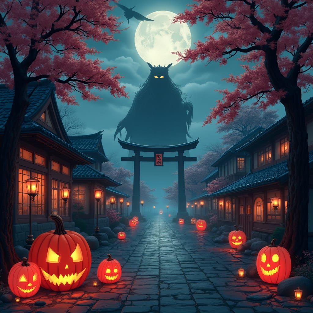This image depicts a beautiful Halloween night in a Japanese village, with red lanterns, oni jack-o'-lanterns, and yokai emerging from mist. Blends Japanese folklore with Halloween traditions in a fantasy illustration style.