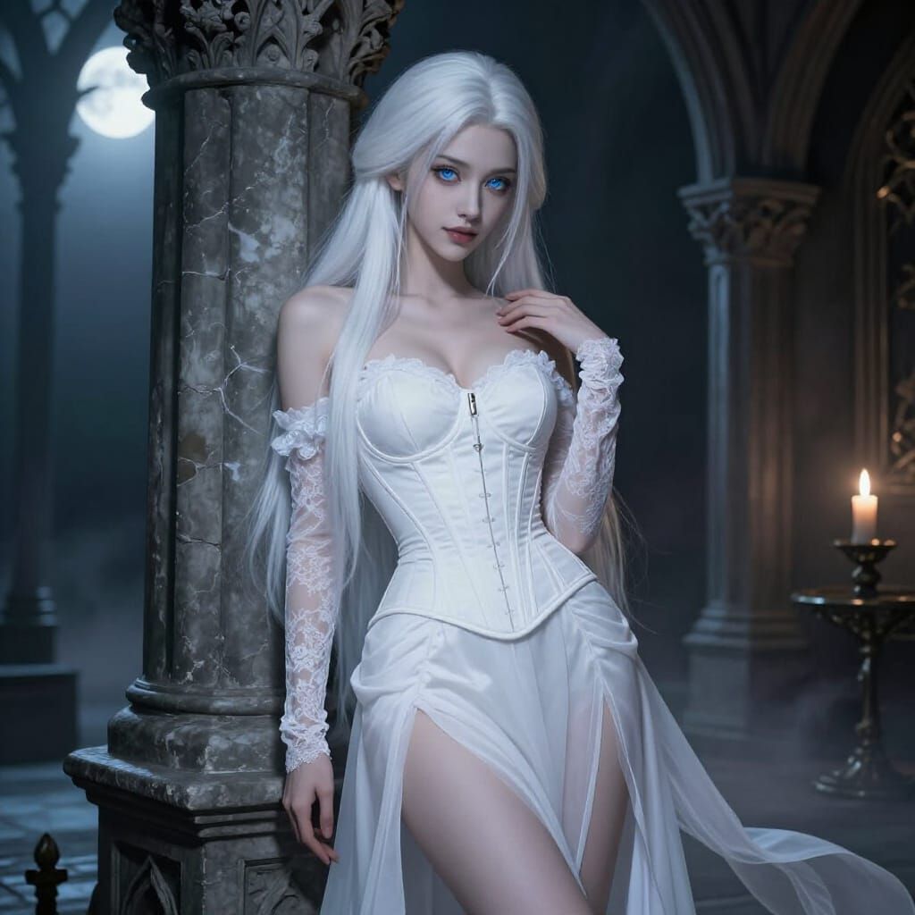 This cinematic image features a pale woman with white hair and blue eyes in a gothic courtyard. She wears a white corset dress, posed elegantly against a stone pillar under misty moonlight.