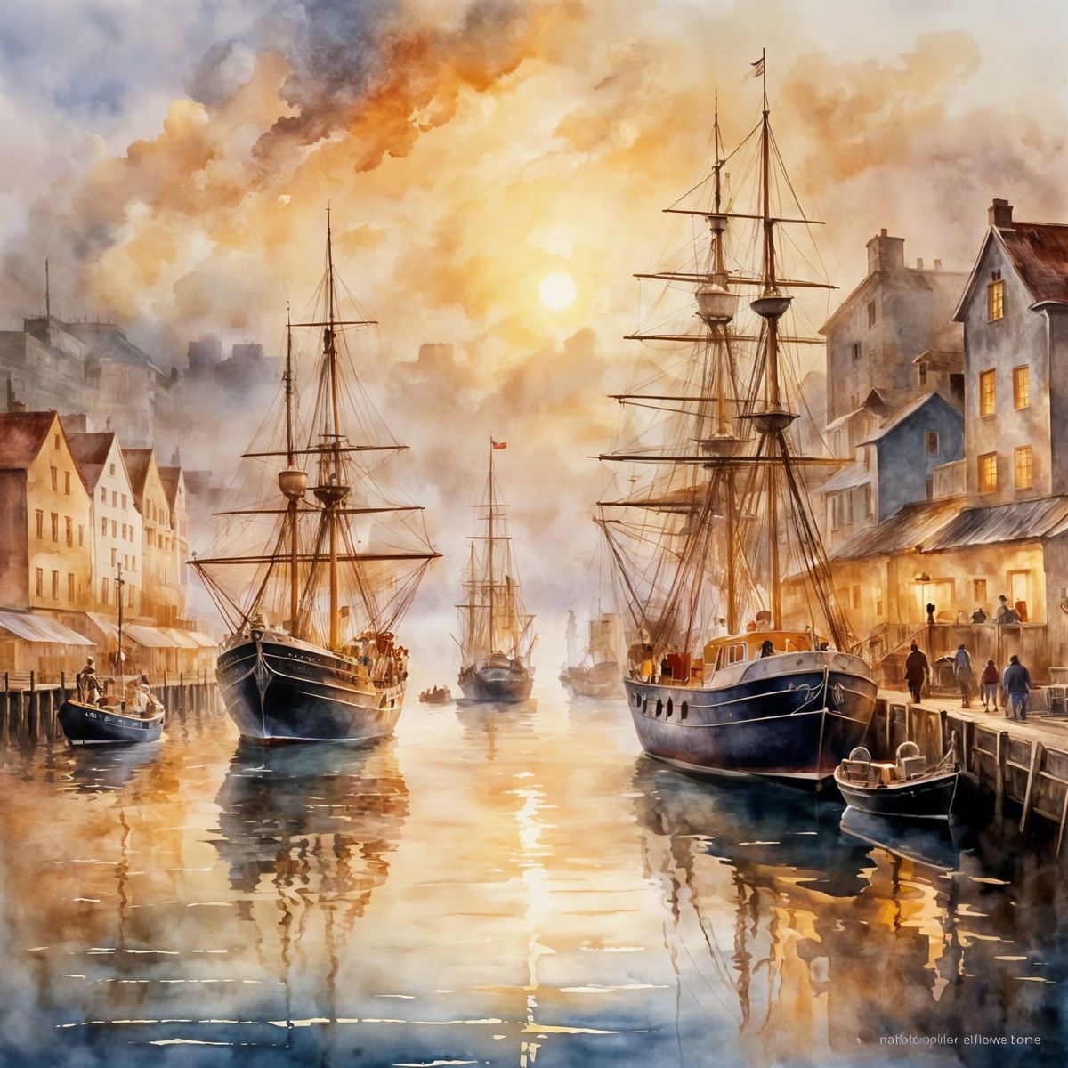 This image depicts workers standing tall near a harbor, capturing the essence of maritime life. The scene evokes a sense of labor and resilience by the seaside.