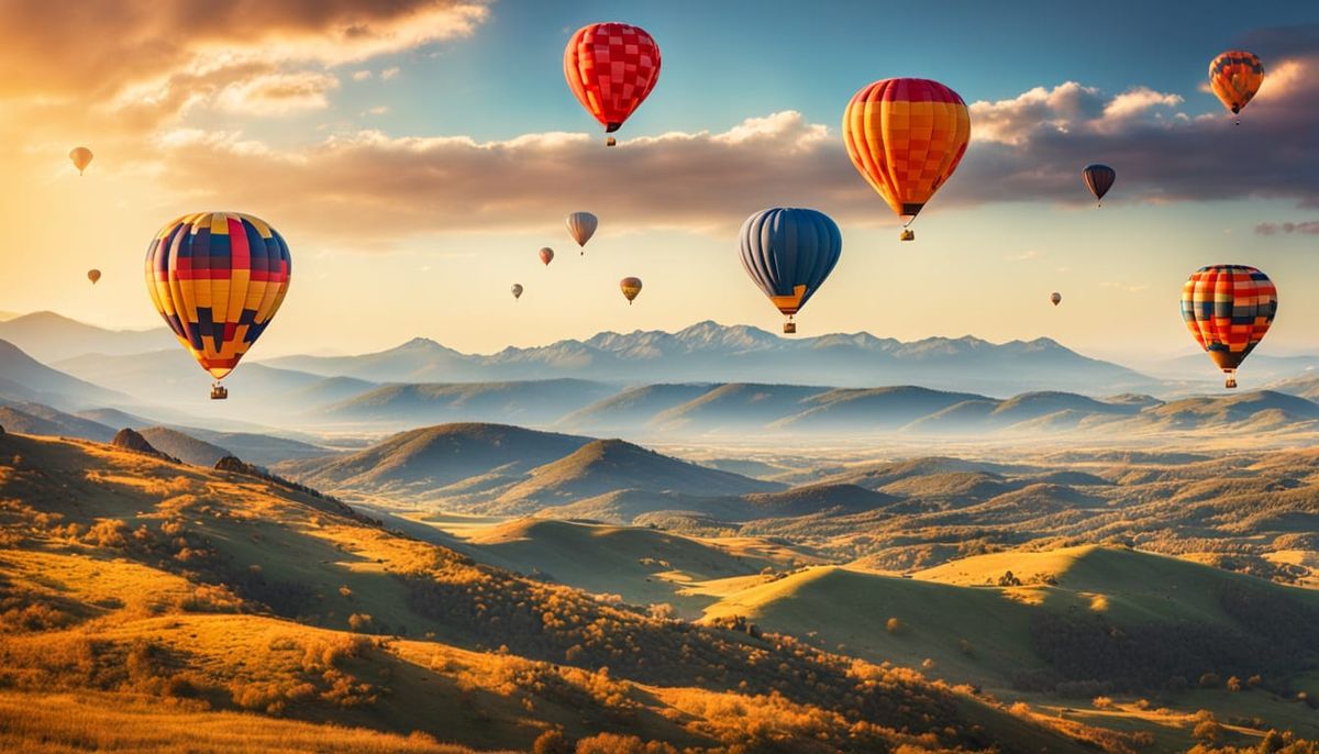 This image shows a vibrant landscape photograph of colorful hot air balloons drifting over a valley and mountains. The aerial view features soft bokeh and warm sunshine.