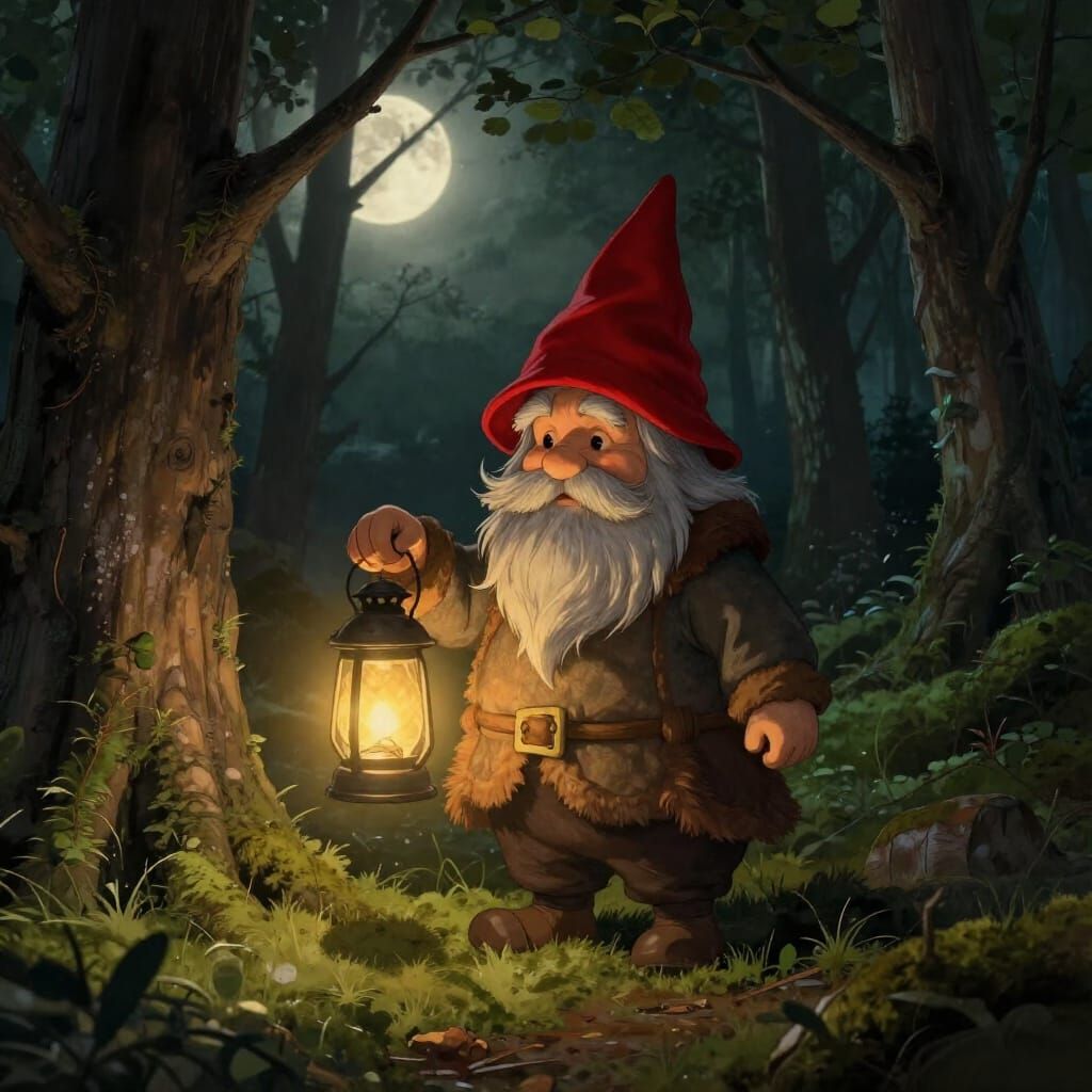 This image shows a wise, old Tomtegubben holding a lantern in a mystical forest clearing. Rendered in a detailed, illustrative style evoking classic Scandinavian folklore art with a serene atmosphere.