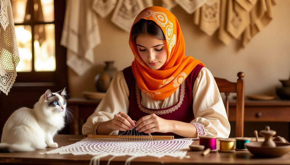 This image shows a woman focused on lace-making with a cat watching. The scene is softly lit with chiaroscuro, reminiscent of Old Masters' oil paintings, highlighting detailed textures and quiet craftsmanship.