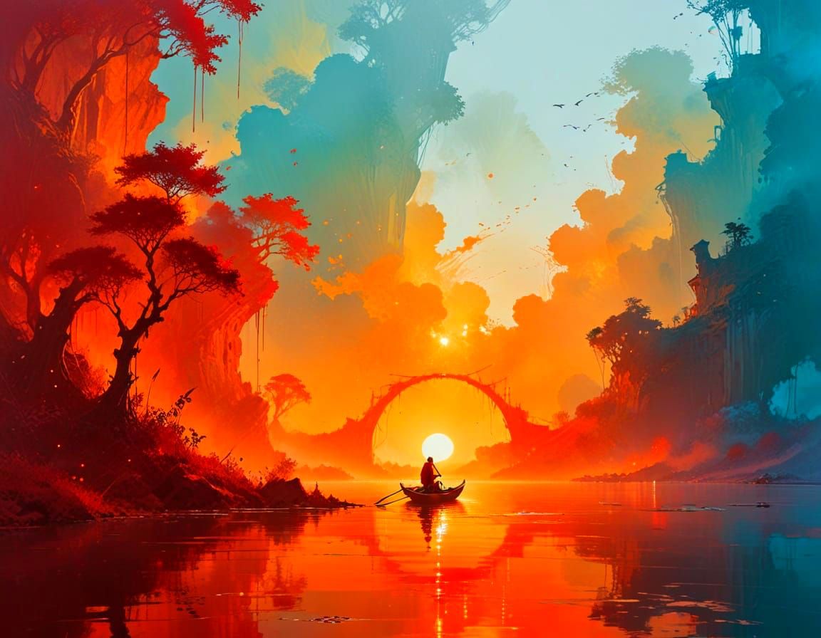 This enchanting image features a hooded figure and a kitten in a small boat, gently gliding across a deep red body of water, beneath a mystical archway with intricate details and a warm golden glow. Soft foliage and a subtle sky gradient complete the ethereal atmosphere.