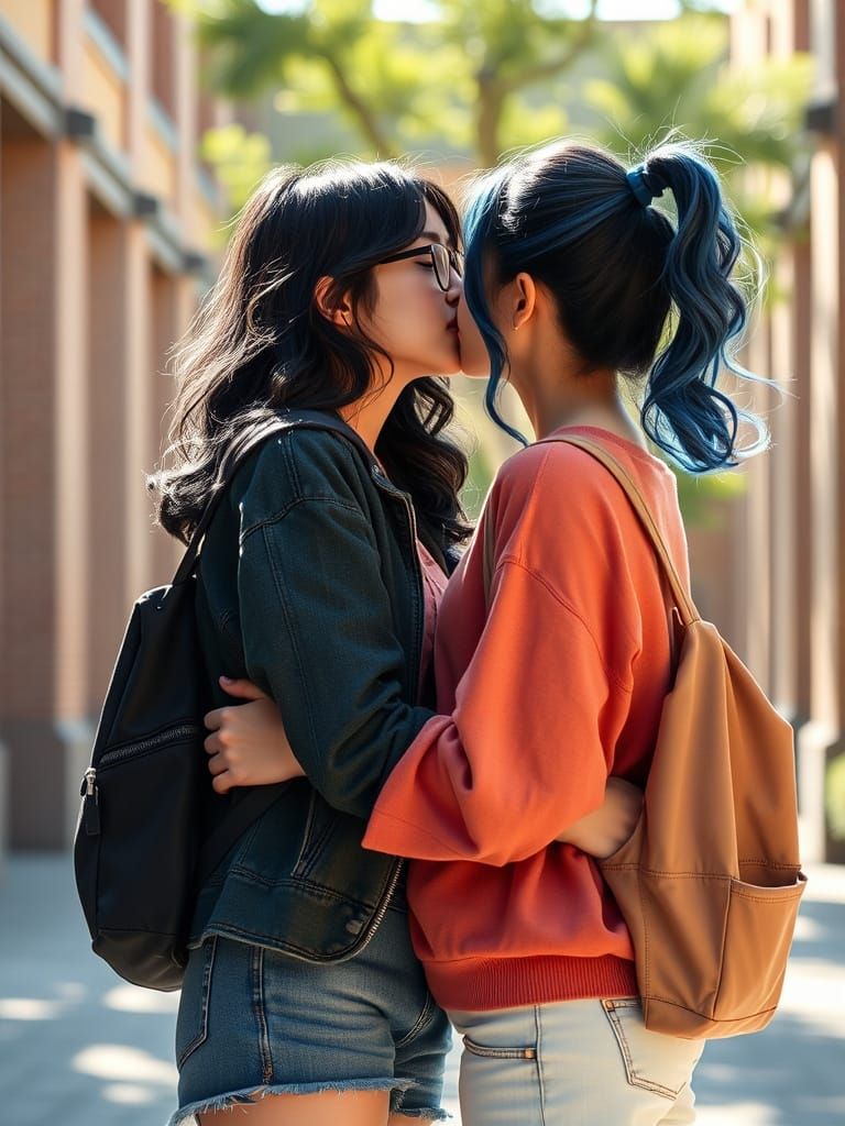 A romantic moment of two young women embracing and kissing in a sunlit college courtyard, captured in a soft, ethereal light with a dreamy atmosphere.