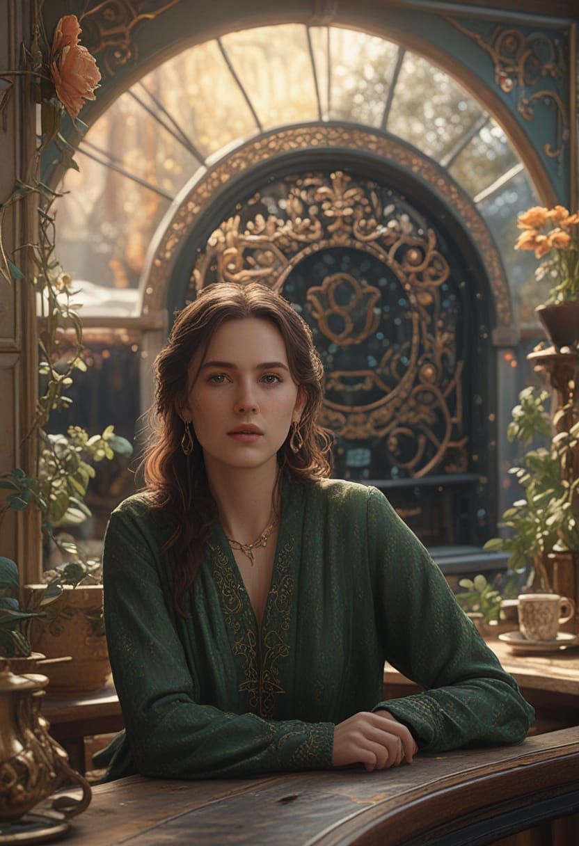 This enchanting image depicts a young woman gazing out a cozy coffee shop window, surrounded by soft pastel hues and intricate details. The scene exudes a mystical ambiance, with gentle lighting and realistic textures, reminiscent of Art Nouveau and Gustav Klimt's elegant style.